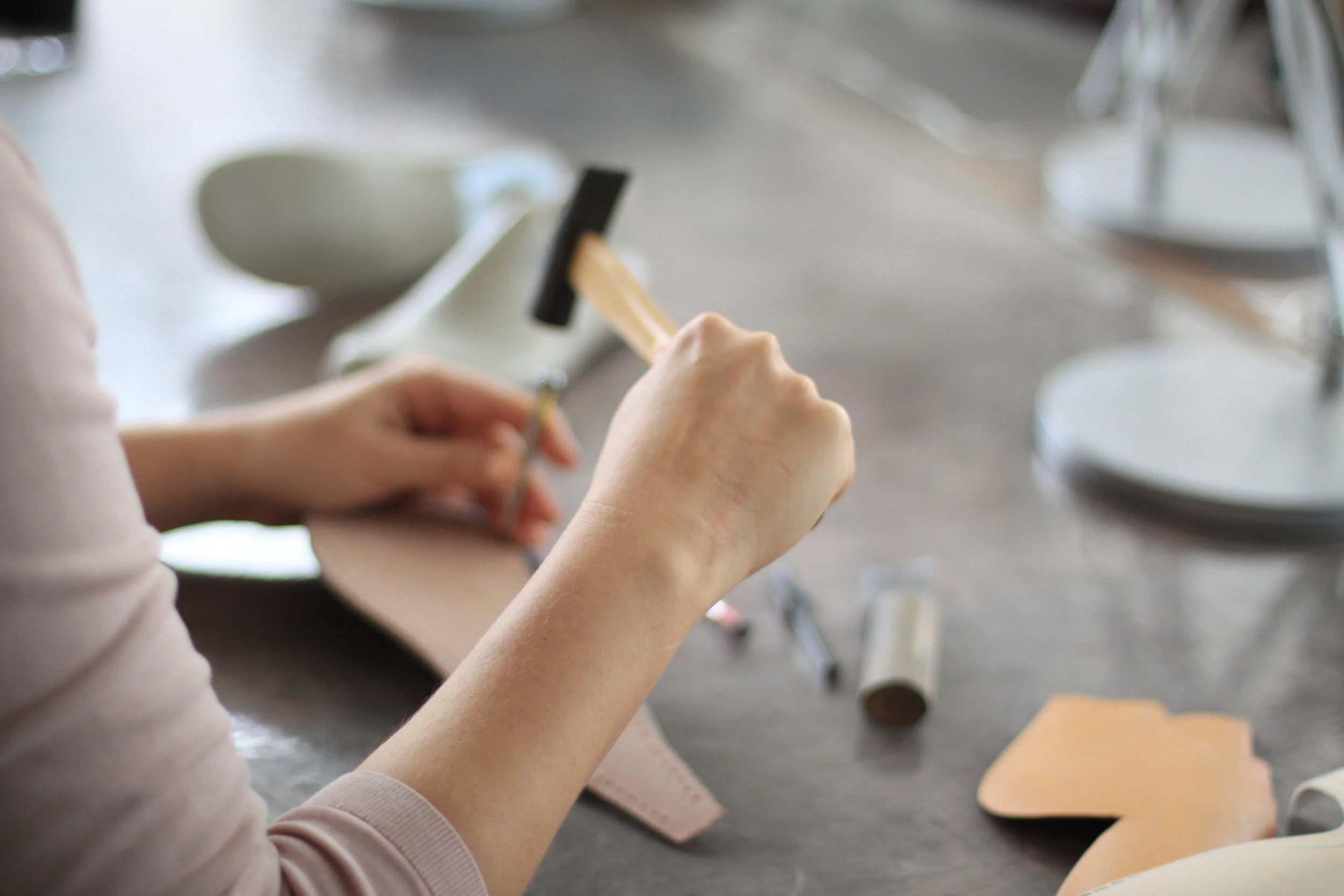 1993年モゲ・ワークショップのワーカーズにてクツの専門技法を手につけ、1995年会社員生活を切り上げクツつくりの生活に。